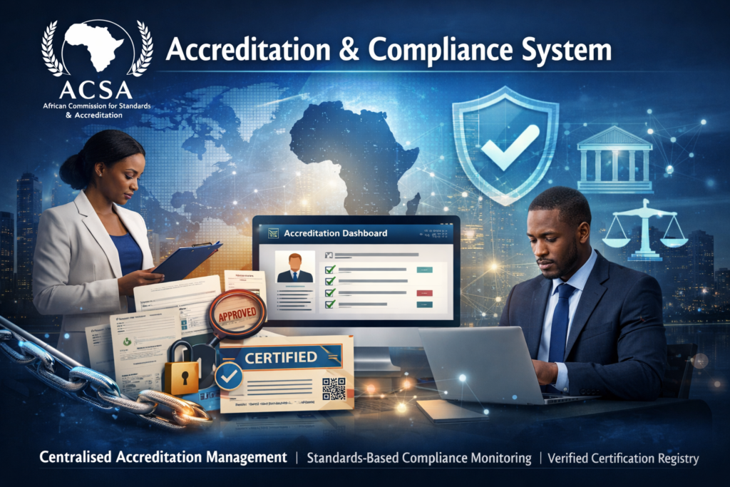 The Accreditation & Compliance System of the African Commission for Standards and Accreditation (ACSA) is a secure digital infrastructure designed to administer accreditation programmes, manage compliance certification processes, and maintain verified professional records within a structured regulatory framework.
